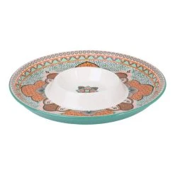 This gorgeous Pelagie Chip & Dip Platter from Casa Domani is perfect for your next get-together. Crafted from durable ceramic and decorated with a beautiful Middle Eastern motif, it is the perfect combination of form and function. With a separate dip compartment and room for a variety of snacks and finger food, this 35cm round platter will make any event special. The platter is easy to clean and dishwasher safe for added convenience. It is sure to be a party favorite for years to come.